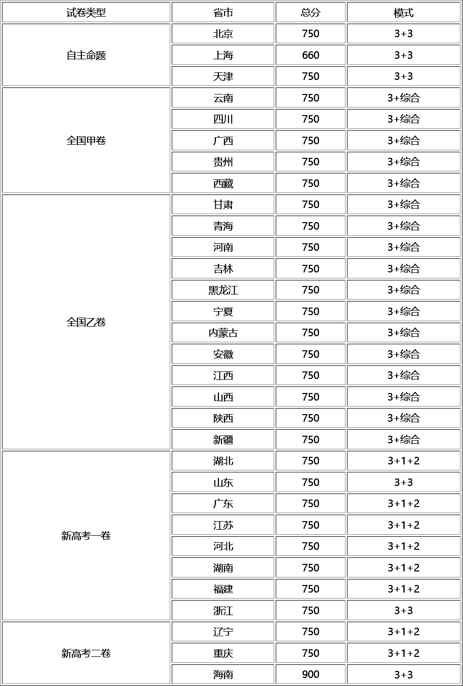 最详细!31省市2023年高考模式、试卷使用情况统计!高考是人生的一次重要转折,其重要性不言而喻。离2023年高考还剩一百多天了,在高考即将来临之际,名校综合评价对全国内地31个省、市、自治区高考的模式及试卷类型进行了梳理总结,家长及考生们提前了解清楚是十分必要的。 当前,全国内地31个省、市、自治区的高考模式,共分为三大类型。 **类:采用老高考“3+文科综合/理科综合”模式 老高考“3+文科综合/理科综合”模式,各考6个学科,4种试卷,即报考文科的学生考:语文、数学、英语和文科综合,报考理工科的学生考:语文、数学、英语和理科综合。 语文、数学和英语等三个学科各150分,共450分。文科综合和理科综合均为300分。高考总分是750分。 采用这一高考模式的有17个省、市、自治区。分布在西南地区和西部地区的云南、贵州、四川、西藏和广西,以及西部地区、北部地区、东北部地区、中部地区的甘肃、青海、新疆、内蒙古、宁夏区、陕西、山西、黑龙江、吉林、江西、安徽、河南。 第二类,采用新高考“3+1+2”模式 采用新高考“3+1+2”模式的是“七省一市”,分别是广东、福建、湖南、湖北、河北、辽宁、江苏和重庆。 既有西部地区,也包括东北地区、中部地区、东部地区、南部地区,具有明显的实验性质。高考考试科目,包括语文、数学和英语三门必考,其他三门高考科目,分为两个类别。 一种类型是首选物理,再选科目从化学、生物、思想政治、地理等4个学科中选择两个学科,作为选考科目。物理采用原始分制,其他两个学科采用赋分制。 另一种类型是首选历史,再选科目也是从化学、生物、思想政治、地理等4个学科中选择两个学科,作为选考科目。历史采用原始分制,其他两个学科采用赋分制。 采用这种类型的省、市,语文、数学和英语等三个学科各150分,三门选考科目各100分。高考总分也是750分。 第三类,采用新高考“3+3”模式 采用新高考“3+3”模式的省、市,主要有北京、上海、天津、浙江、山东、海南。 高考模式是语文、数学、英语等三个学科各150分。其他选考科目,从物理、化学、生物、思想政治、历史、地理等六个学科中任意选择三个学科作为高考科目,各100分;其中,浙江省与其他省、市不同的是,选考科目共有七个学科,通称“七选三”,多出的一个学科是技术学科,由信息技术、通用技术各占50分组成。高考总分也是750分。 2023年除了浙江省高考试卷有所调整外,其余各省市采用的试卷基本与2022保持一致,浙江省语数外三科由原来的自主命题变为采用新高考一卷。其他“七选三”科目,由浙江省自主命题。2023年全国内地31个省、市、自治区的高考试卷,各具特色。主要包括以下7套试卷: 一、老高考全国甲卷:3+文科综合/理科综合 使用地区:云南(新教材)、四川、广西、贵州、西藏(5省区) 试卷特点:使用全国高考甲卷地区的试题省份,试题全部由国家教育部考试中心命制,试题难度相对小一些,有利于这些省市高考选拔和教育教学的发展。 试卷科目:语文、数学、外语、文综、理综 二、老高考全国乙卷:3+文科综合/理科综合 使用地区:山西、安徽、吉林、黑龙江(这四个省使用新教材);内蒙古、陕西、甘肃、青海、宁夏、新疆、江西、河南(12省区) 试卷特点:使用全国乙卷的省份较多,这几个省份的大多数高考人数较多、教育资源水平发展较相似,所以五个学科都是由国家教育部考试中心统一出题,试题的难度相对较大,保证公平性。 试卷科目:语文、数学、外语、文综、理综 三、新高考全国Ⅰ卷:3+1+2/3+3 使用地区:山东、广东、湖南、湖北、河北、江苏、福建、浙江(8省) 试卷特点:使用新高考一卷的省份,语文、数学、英语由国家教育部考试中心统一命题,其他各科目试卷由本省自行命题。2023年浙江省语数外三科由原来的自主命题变为采用新高考一卷。其他“七选三”科目,由浙江省自主命题。浙江还另有技术科(含通用技术和信息技术)。正是由于各省、市的选考科目自主命题,试题难度相差迥异,试题的风格和难度迥异,呈现出春色满园的特点。 试卷科目:语文、数学、外语、物理、化学、生物、政治、历史、地理、信息技术等。 四、新高考全国Ⅱ卷:3+1+2/3+3 使用地区:辽宁、重庆、海南(3省市) 试卷特点:新高考2卷的省份,语文、数学、英语由国家教育部考试中心统一命题,其他选考科目试题,由各省自主命题。 试卷科目:语文、数学、外语、物理、化学、生物、政治、历史、地理等。 五、自主命题:天津卷、上海卷、北京卷(3+3) 使用地区:天津、上海、北京(3市) 试卷特点:经济水平发展较好,教育资源集中且教育水平在全国领先,全部自主命题,这三个直辖市的高考试题,难度相对较小,难度的梯度把握比较好,试题的区分度比较高。 试卷科目:语文、数学、外语、物理、化学、生物、政治、历史、地理等。 不同省份高考的试卷类型和考试模式不一样,分数也不同,以下是2023年全国各省市高考试卷类型一览表,大家可以参考: